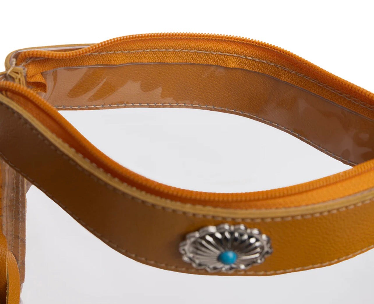 Brighten up any outfit with this Myra clear western leather handbag in orange! The cheerful leather trim, accented with matching fringe, brings a bold Western touch, while the ornate concho adds a hint of rodeo charm. Designed for both style and practicality, this western shoulder handbag features a secure zipper closure and a detachable, adjustable leather strap for versatile wear. It's a great choice for your quick everyday outings.