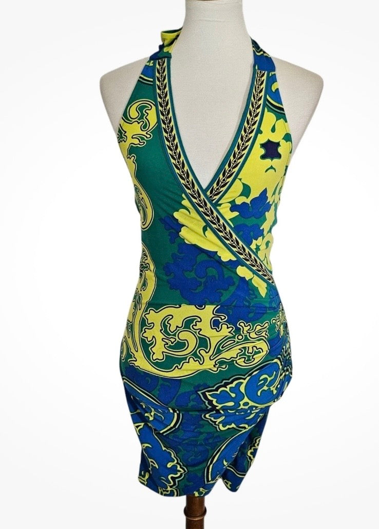 *PREOWNED* vibrant blue and yellow halter dress from Hale Bob. Size XS and in excellent condition. Perfect for any occasion, this dress combines style and comfort effortlessly.