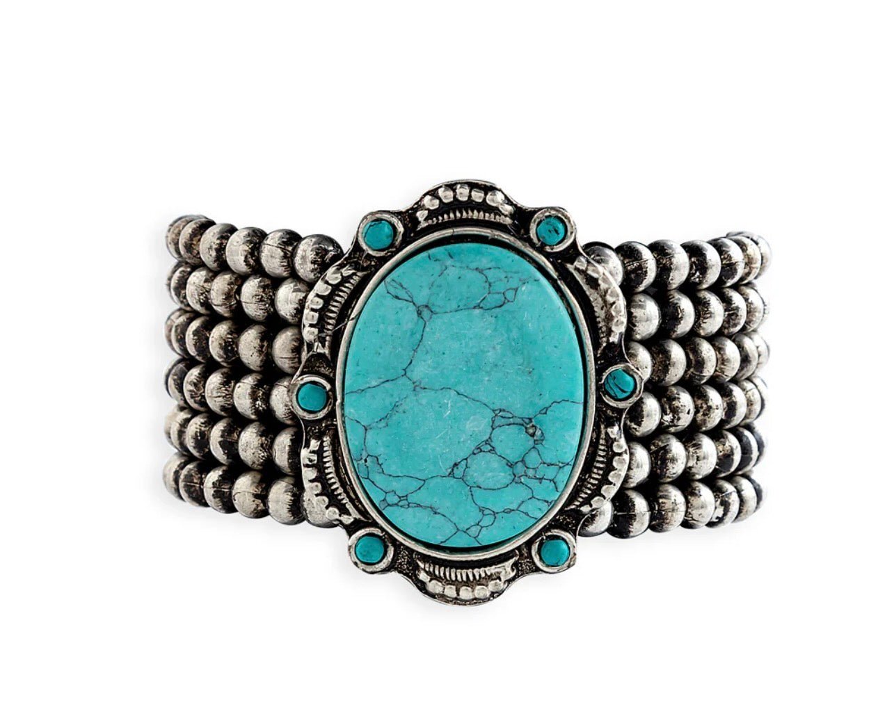 A center stone of turquoise is lovingly embraced by scrolled metalwork, and graced with small accent beads. The stacked strands of silver beads will make this bracelet a sure standout in your collection.