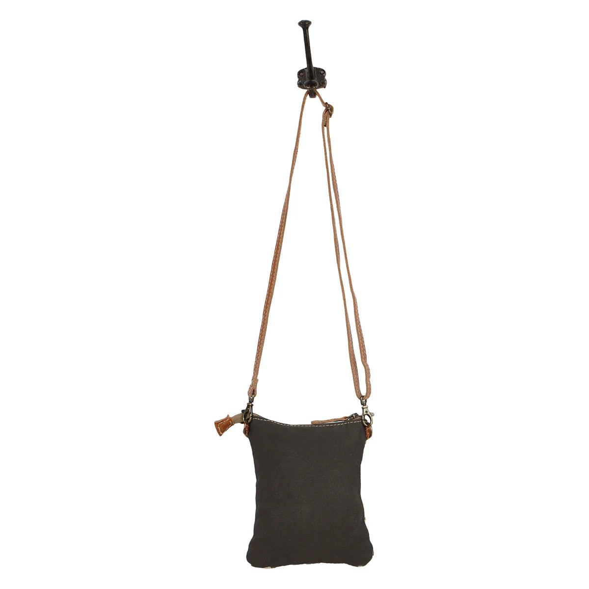The Myra Vuierra Rivet Small Crossbody Bag blends chic aesthetic with rustic flair. Crafted with hairon leather, up-cycled canvas, and genuine leather, this small Western crossbody purse is both stylish and functional. The front pocket adds a touch of charm and utility, while the zippered top ensures secure storage. Coming with a detachable leather strap, this Western style crossbody purse is perfect for ranch adventures, everyday.