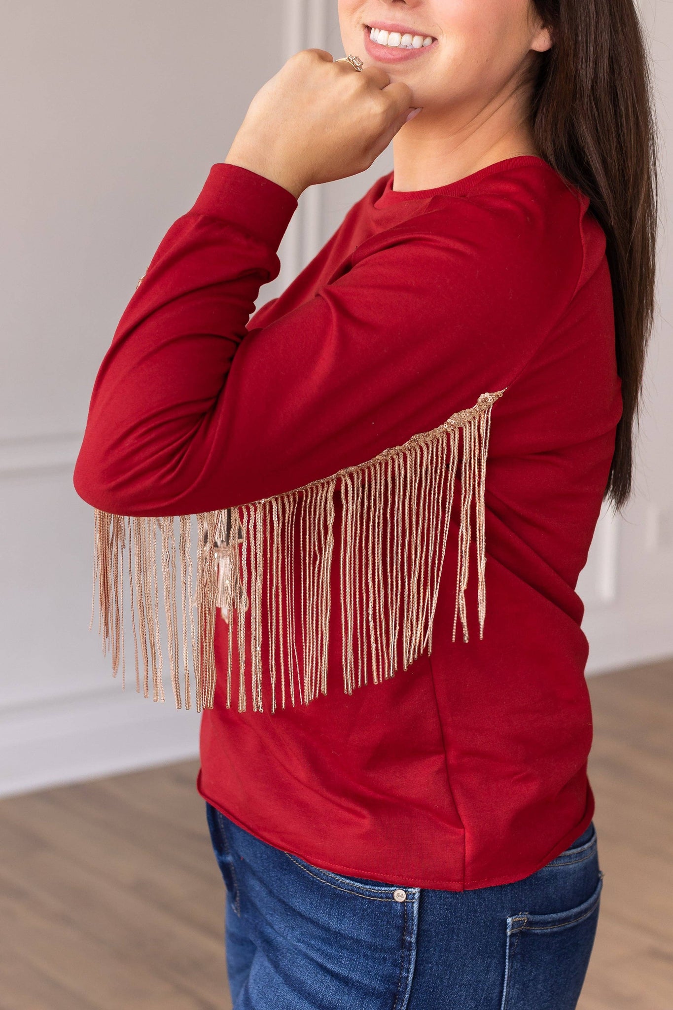 The unique cowhide tree design and sequin fringe detail add a touch of Western flair and holiday cheer to the vibrant red top. Whether you're attending a holiday party, festive gathering, or simply want to make a bold fashion statement, this top effortlessly enhances your look with a blend of elegance and playful sparkle.
